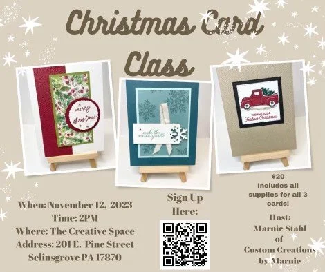 Christmas Card Class with Marnie Stahl Sunday, November 12, 2023 2:00 PM 4:00 PM The Creative Space in Selinsgrove Pine St Selinsgrove, PA 17870 USA (map) Google Calendar ICS
