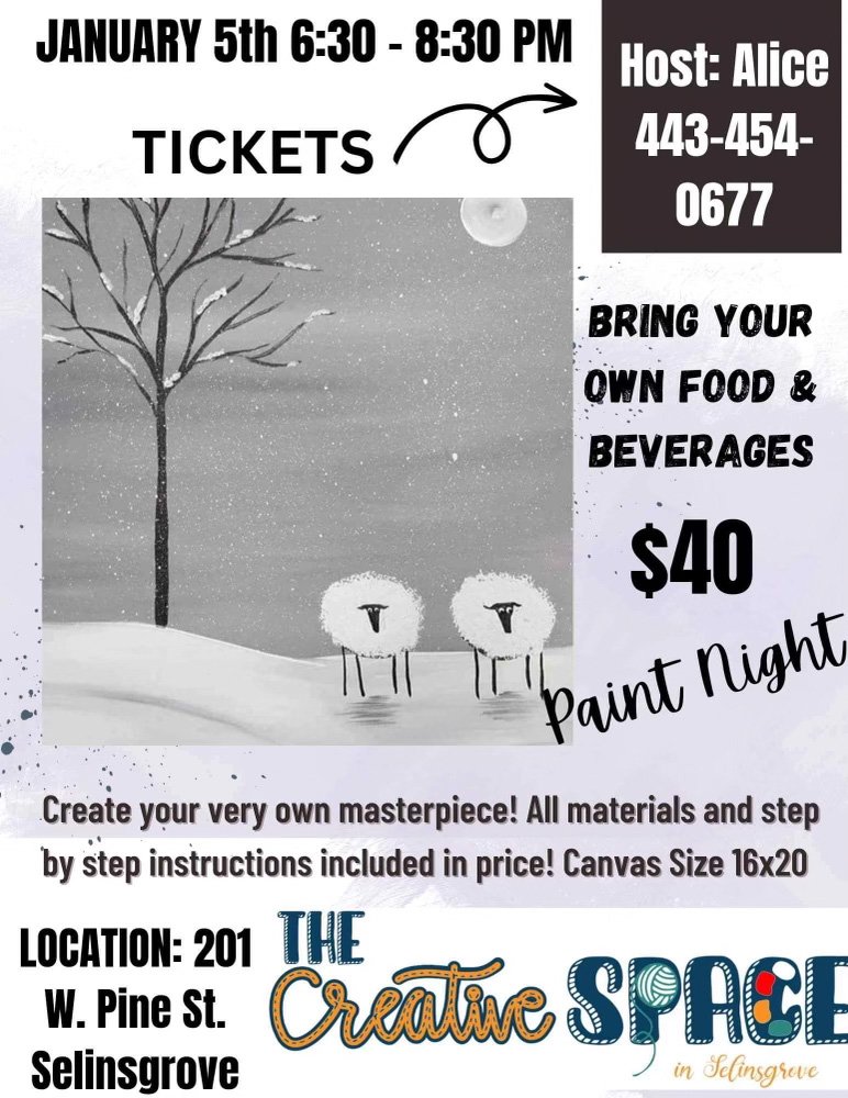 Paint Night with Alice Friday, January 5, 2024 6:30 PM 8:30 PM The Creative Space in Selinsgrove Pine St Selinsgrove, PA 17870 USA (map) Google Calendar ICS